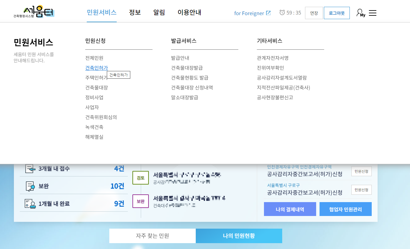 로그인 후 상단의 민원서비스의 건축인허가 클릭